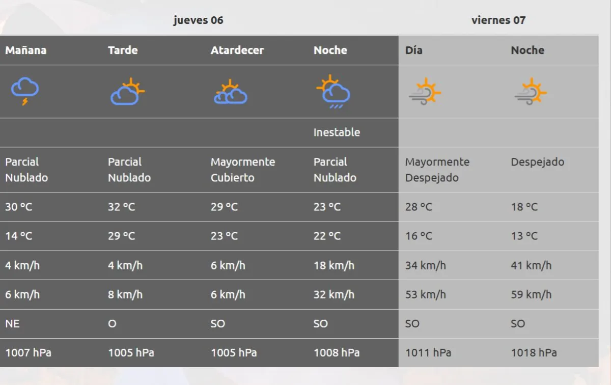 El viernes vuelve el viento a la región, con ráfagas que llegan hasta los 60 km/h. Hacia el fin de semana, bajan las temperaturas, pero el cielo se mantendrá soleado.
