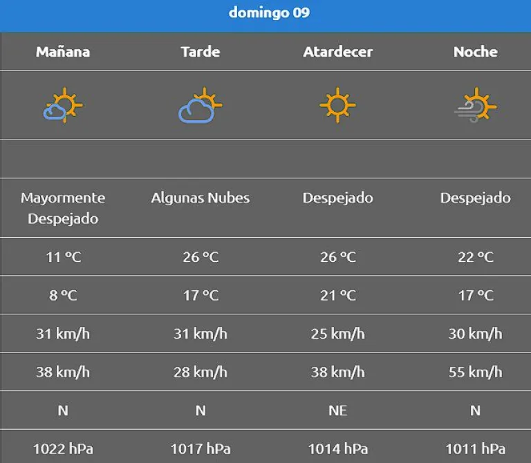 Se esperan ráfagas que podrían alcanzar los 38km/h durante la tarde. El cielo se mantendrá despejado y con algunas nubes durante la tarde.  Para la próxima semana, desde el martes empieza el descenso de la temperatura propio del otoño en el Alto Valle.