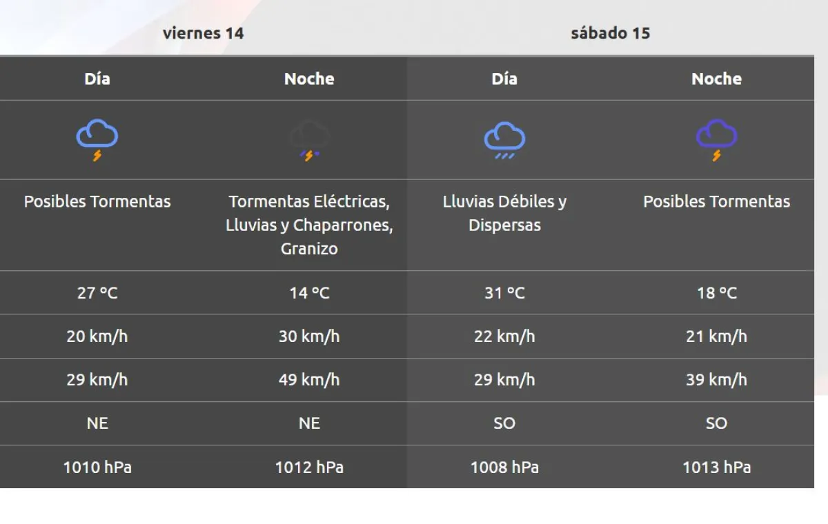Para la noche del viernes está pronosticada una tormenta eléctrica, lluvias, granizo y chaparrones que podría extenderse hasta el sábado. A partir del domingo leve descenso de la temperatura que seguirá durante toda la semana.