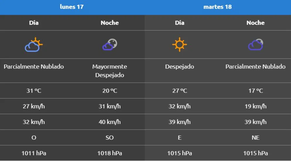 En la mayor parte del día, el viento circulará a 27 kilómetros por hora mientras que al finalizar la jornada, se esperan ráfagas de hasta 40 kilómetros por hora provenientes del sudoeste.