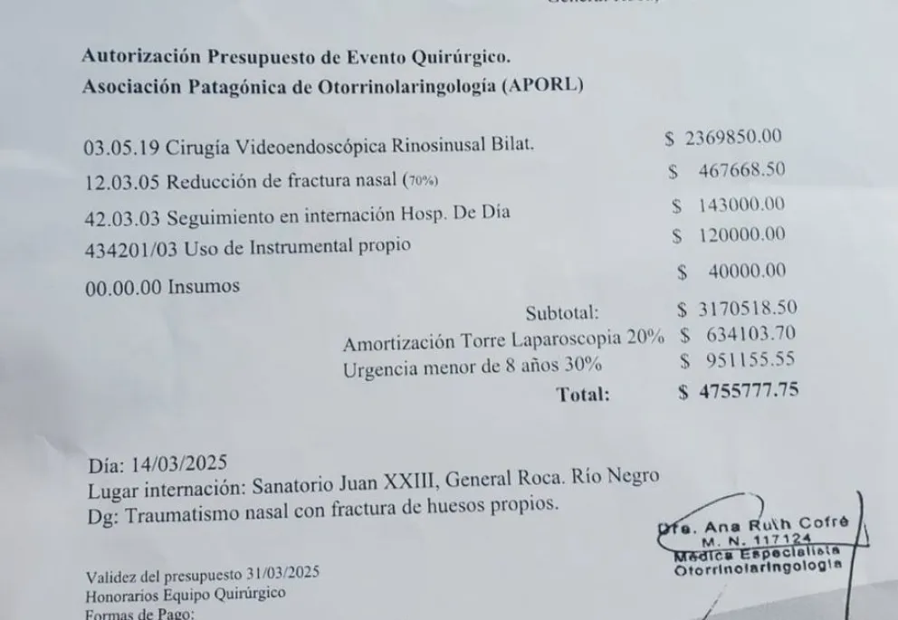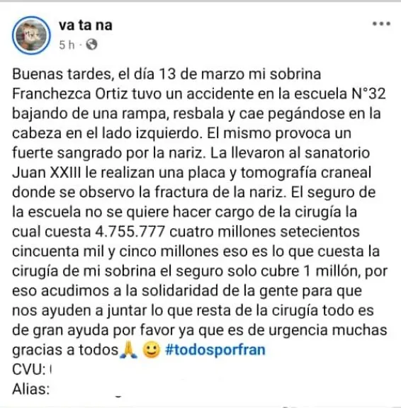 Según explicó la familia, la cirugía tiene un costo total de $4.755.777, de los cuales el seguro solo cubre $1.000.000. Ante esta situación, la madre de la niña apeló a la solidaridad de la comunidad para reunir el dinero necesario lo antes posible, ya que la médica encargada de la operación entrará en licencia la próxima semana.