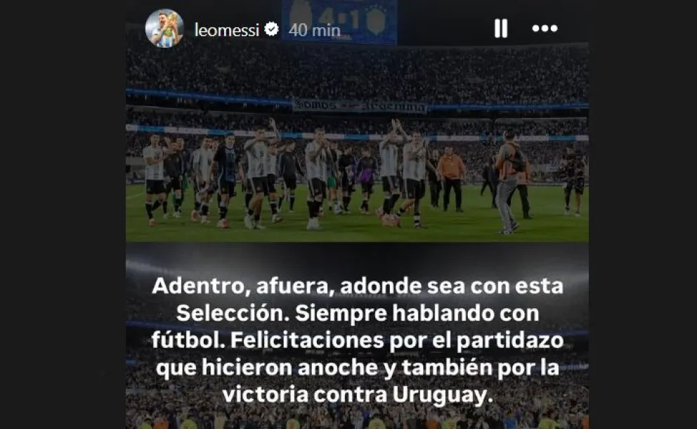 Este tipo de posteo no es una novedad en Messi, conocido por dejar que su talento en el campo hable por él. Su mensaje subraya un futuro optimista para la selección, propulsado por la creencia incuestionable de que los partidos se ganan con fútbol consistente e intachable en toda circunstancia.