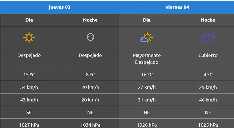 Durante la jornada el clima se mantendrá mayormente despejado, con un clima fresco. Se espera que desde hoy en adelante ingresa aire polar a la región, con temperaturas bajo cero.