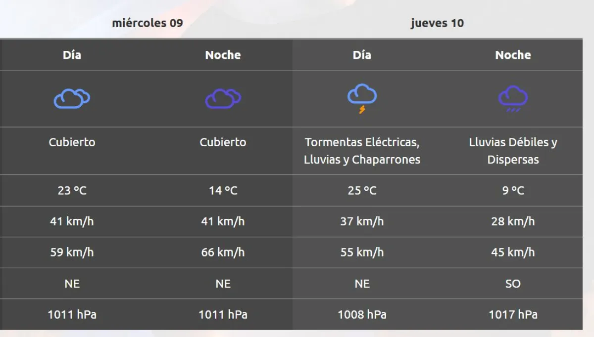Esta condición se reforzará el jueves, ya que se esperan precipitaciones débiles en la zona cordillerana que afectarán el Alto Valle y la zona de mesetas. Se espera formación de tormentas y descenso de la temperatura.