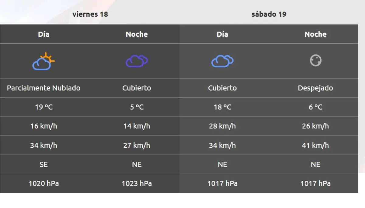La Autoridad Interjurisdiccional de Cuencas emitió su pronóstico para este fin de semana largo de Semana Santa. Para este Viernes Santo 18 de abril se espera una mínima de 5° C y una máxima de 19° C.