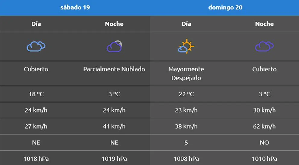 La Autoridad Interjurisdiccional de Cuencas emitió su pronóstico para este fin de semana. Para este sábado 19 de abril se espera una mínima de 3° C y una máxima de 18° C.