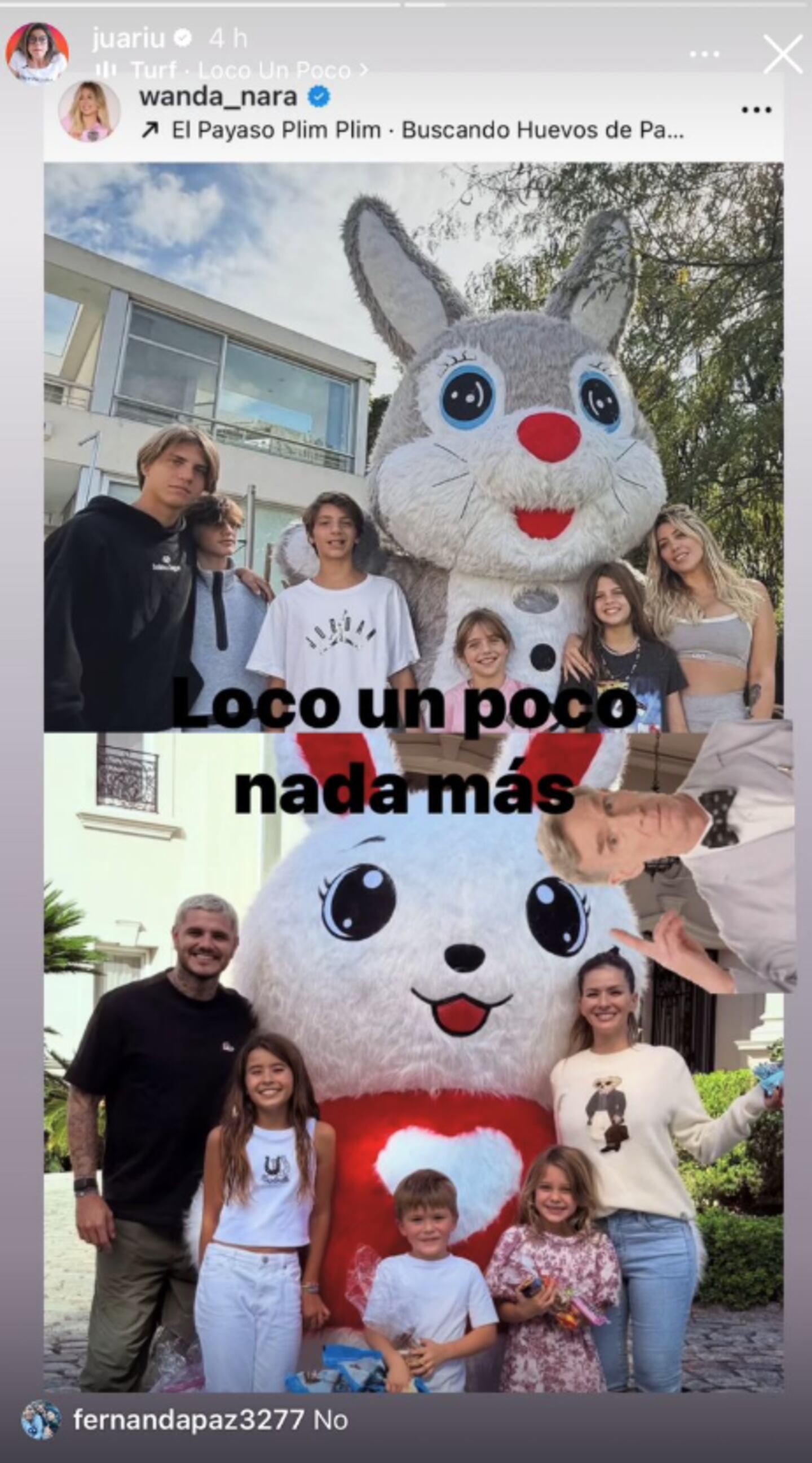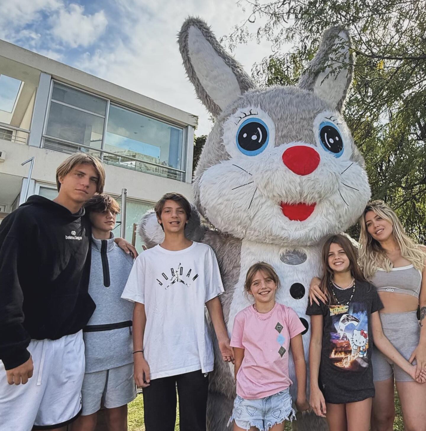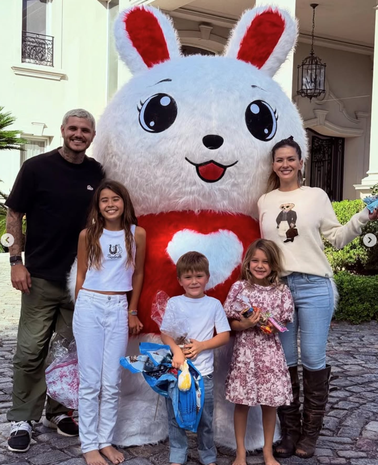 La China Suárez, dispuesta a alegrar a sus tres hijos, Rufina, Magnolia y Amancio, en esta festividad especial, compartió en sus redes sociales una serie de imágenes junto a un conejo gigante. Un verdadero espectáculo visual que claramente buscaba atrapar la atención de los niños. Además, en esta reunión familiar se hizo presente Mauro Icardi, quien posó para las fotos compartiendo un momento distendido con los pequeños.