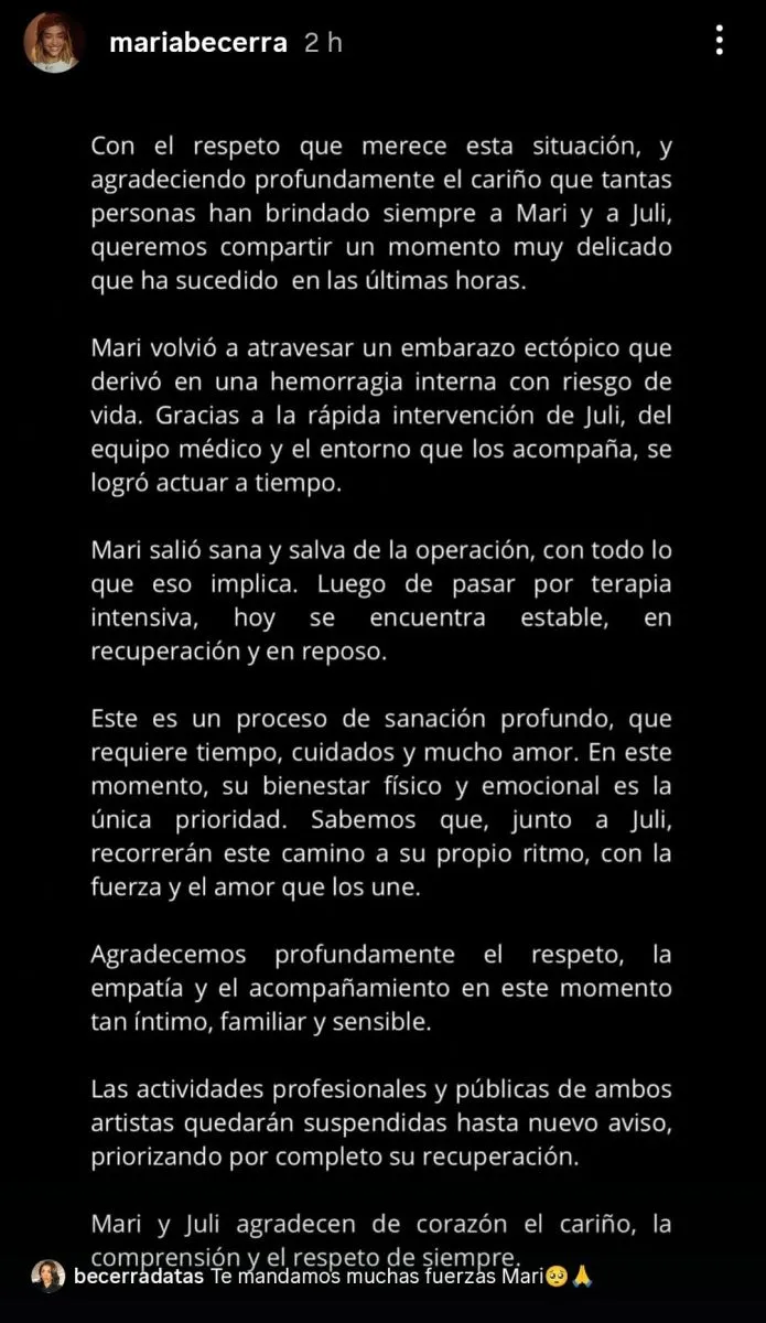 Desde el entorno cercano subrayan que esto no ha sido fácil, y que María y Julián atravesarán juntos este proceso resguardados por el amor y apoyo de sus seres queridos. Pidieron respeto y empatía para ambos, ya que éste resulta ser un momento extremadamente delicado y privado para la pareja. Lamentablemente, todas las actividades públicas relacionadas con su carrera se pospondrán hasta que se recupere totalmente.