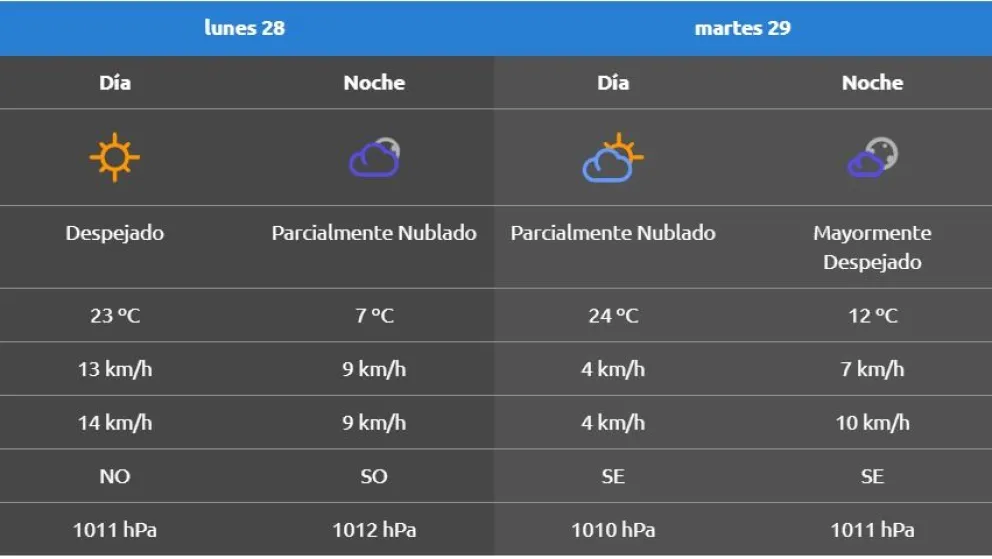 En su reporte diario indicó que durante el día el cielo se mantendrá despejado y soleado mientras que en la noche, se nublará de manera parcial. El viento llegará primero desde el noroeste y luego rotará al sudoeste, a 13 kilómetros por hora.