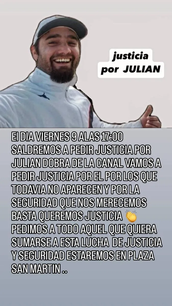 Vamos a salir a pedir justicia por Julián, por él y por todos los que todavía no aparecen”, expresaron en una publicación . Además del reclamo de justicia, se pedirá mayor seguridad en la ciudad. La invitación está abierta a toda la comunidad. Hasta el momento no se confirmó la participación de los padres de Julián.