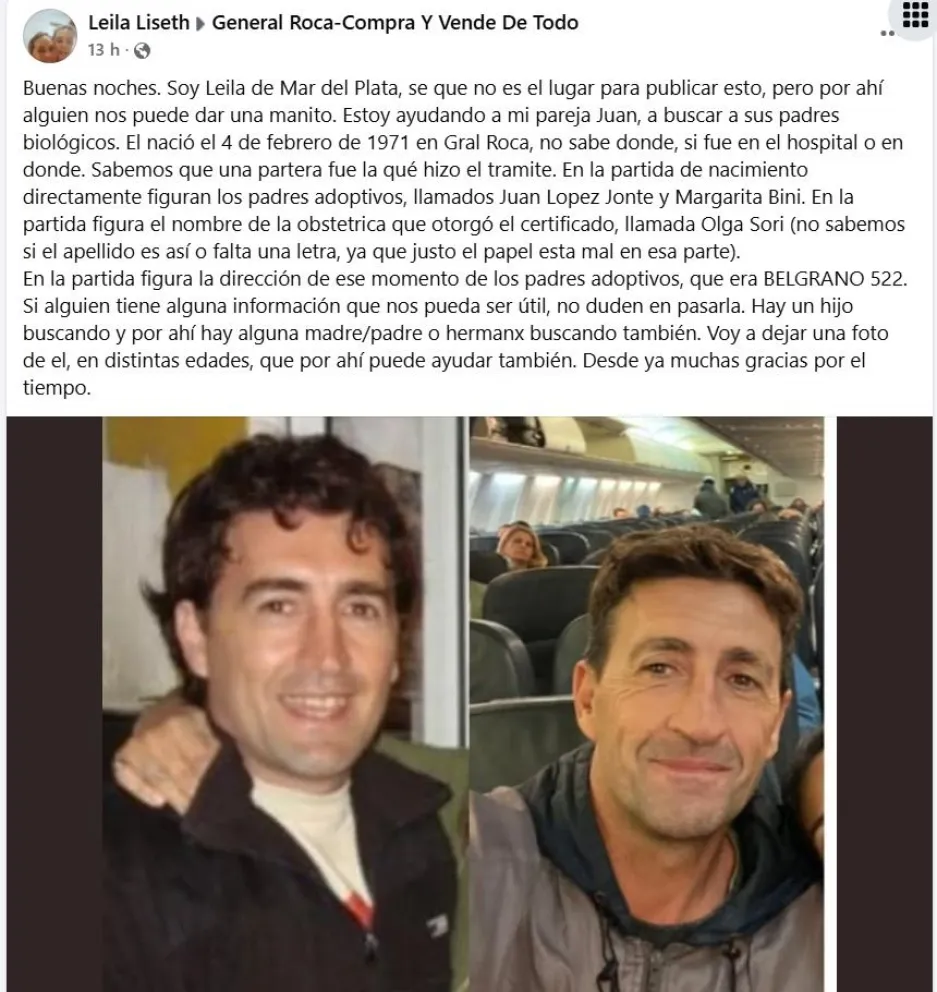 La búsqueda fue publicada en Facebook por Leila, su pareja, quien incluyó algunas fotos de Juan para facilitar el reconocimiento. El objetivo es encontrar personas que puedan aportar algún dato sobre el nacimiento, la obstetra o el contexto de la adopción.