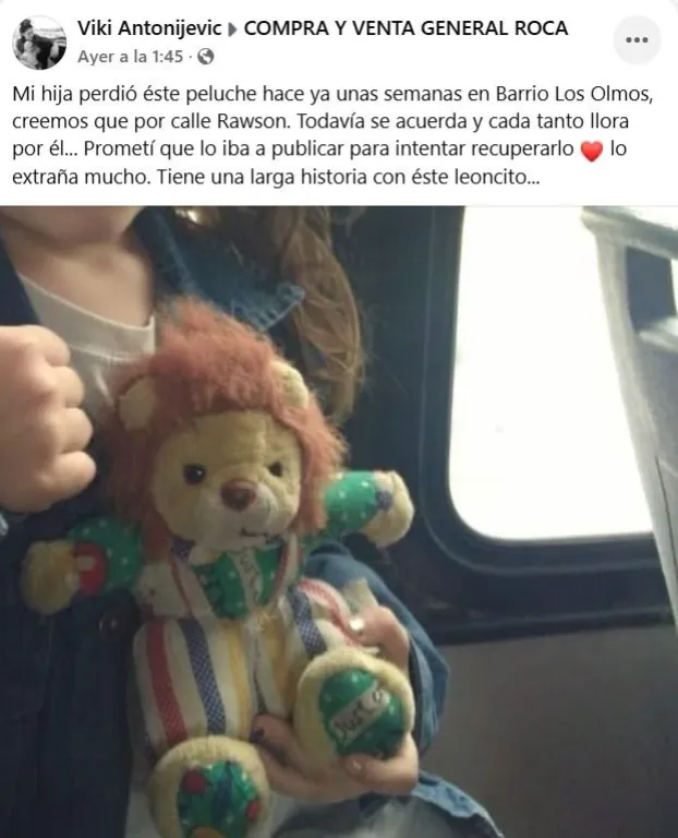 Una vecina de General Roca realizó un emotivo pedido en redes sociales para intentar recuperar el peluche que su hija perdió en el barrio Los Olmos. Se trata de un leoncito que tiene un fuerte valor afectivo tanto para ella como para su hija. La publicación llegó a los vecinos y vecinas que no tardaron en replicar la publicación para intentar dar con el tan apreciado juguete.