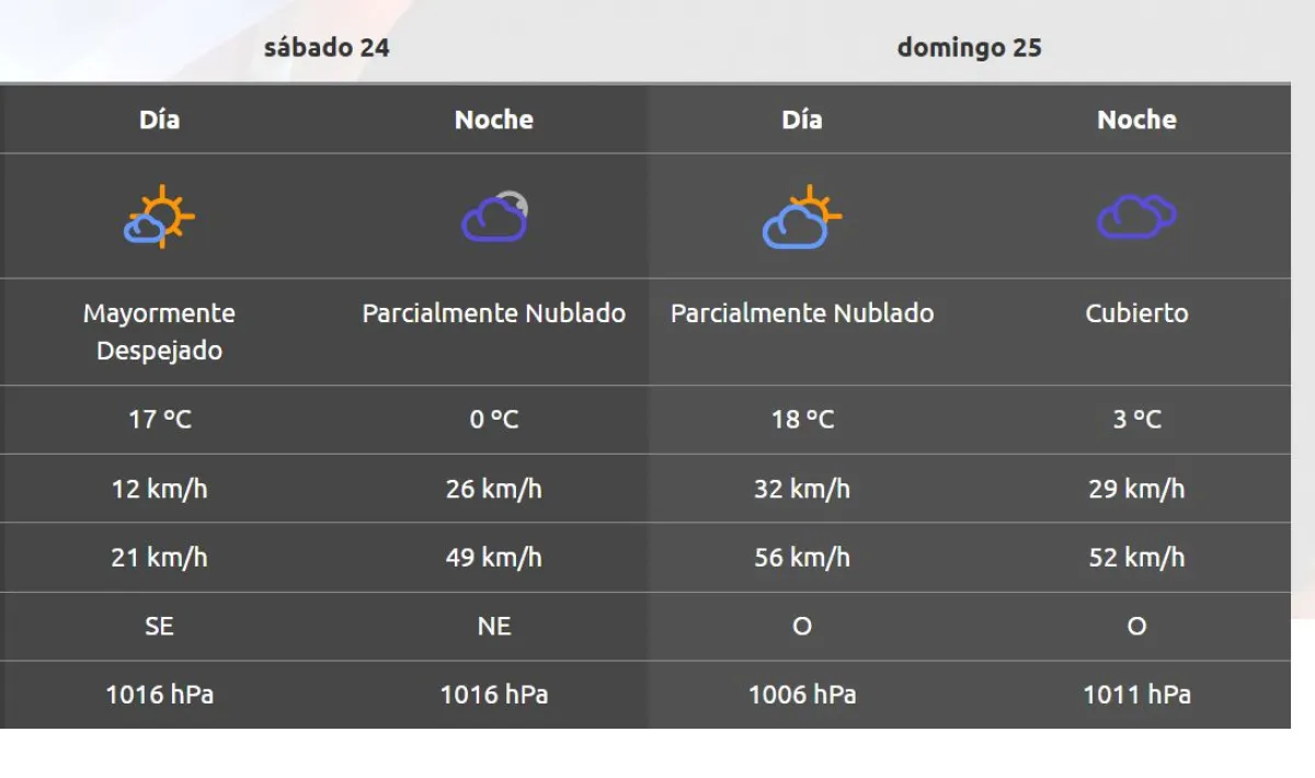 Aire húmedo en cordillera con algunas precipitaciones débiles. Soleado y nubosidad variable en los valles meseta y la costa. Algo inestable. Ascenso de la temperatura durante el fin de semana. El domingo por la tarde ingresa un frente frío con lluvias y nevadas el lunes en cordillera. Períodos de viento e inestabilidad en toda la región. Aire polar la próxima semana y días más fríos.