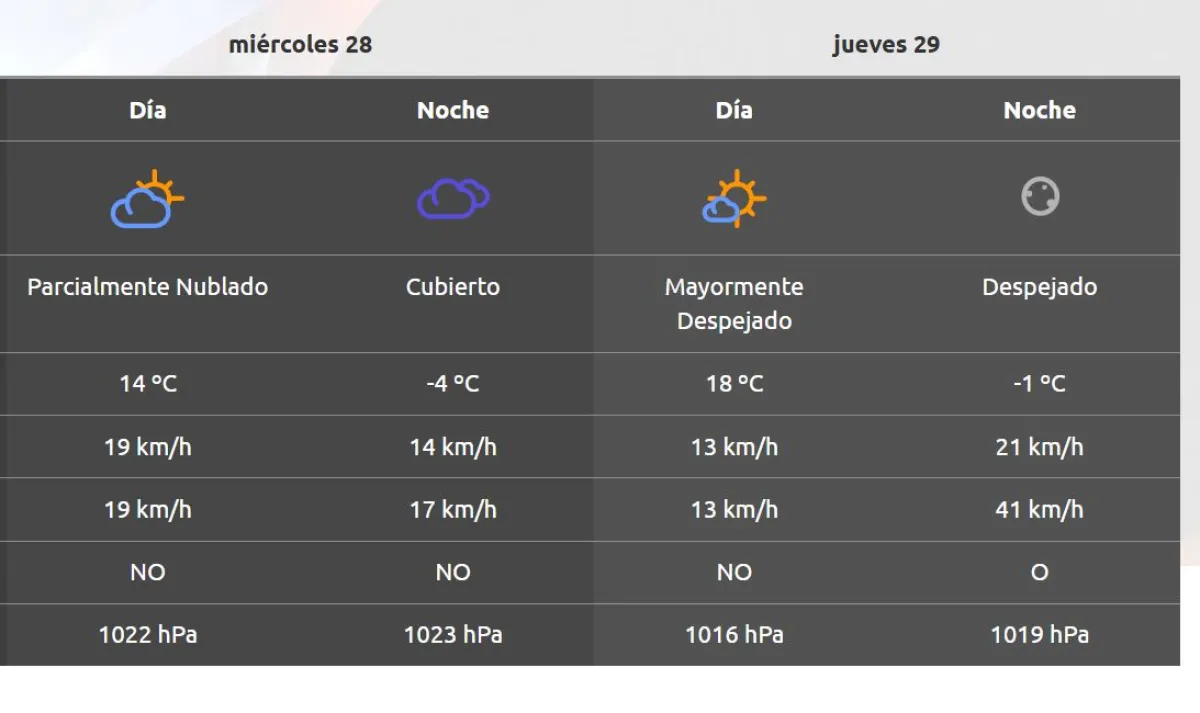 La Autoridad Interjurisdiccional de Cuencas emitió su pronóstico para este miércoles 28 de mayo y el extendido para el fin de semana. Para hoy se espera una mínima de -4° C y una máxima de 14° C.