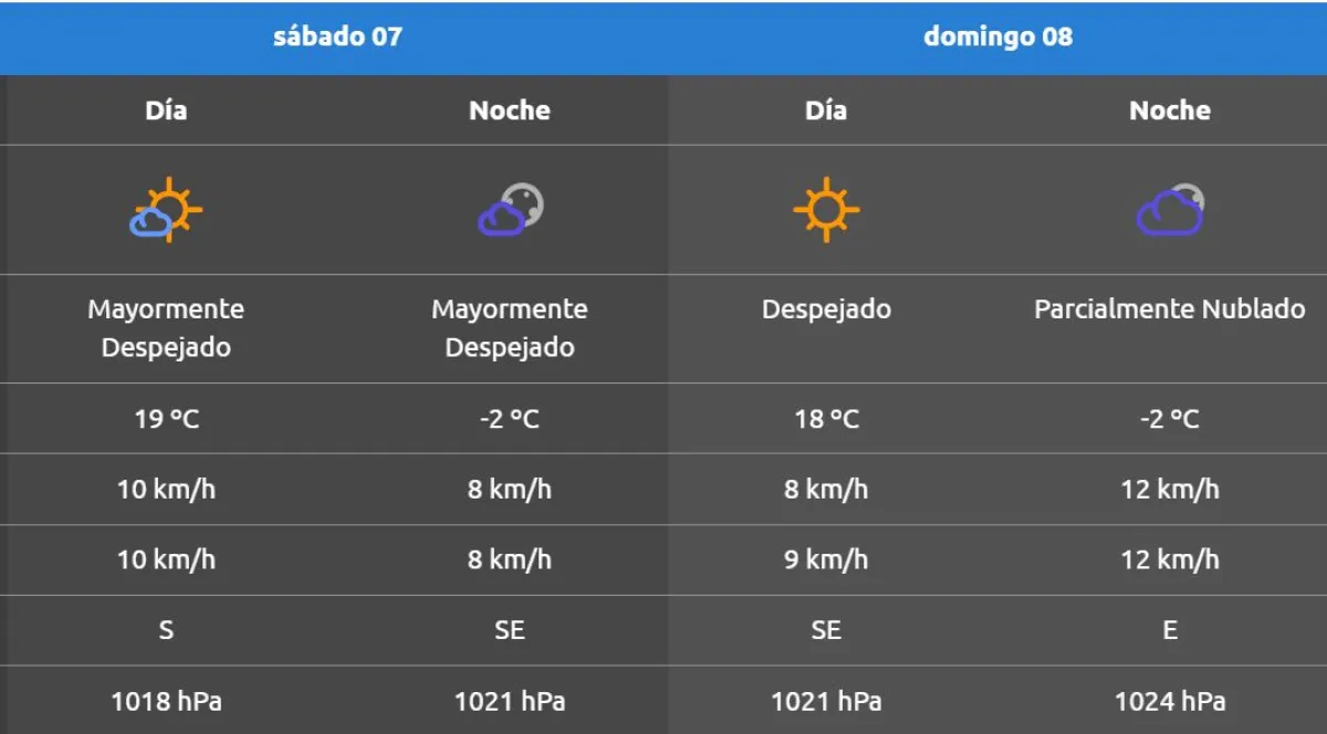 La Autoridad Interjurisdiccional de Cuencas emitió su pronóstico para este sábado 7 de junio y el extendido para el fin de semana. Para hoy se espera una mínima de -2° C y una máxima de 19° C.