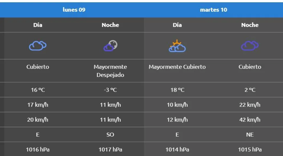 El cielo se mantendrá completamente cubierto, con viento proveniente del este a 20 kilómetros por hora. En la noche, estará mayormente despejado y la temperatura volverá a descender hasta llegar a los 3 grados bajo cero durante la madrugada