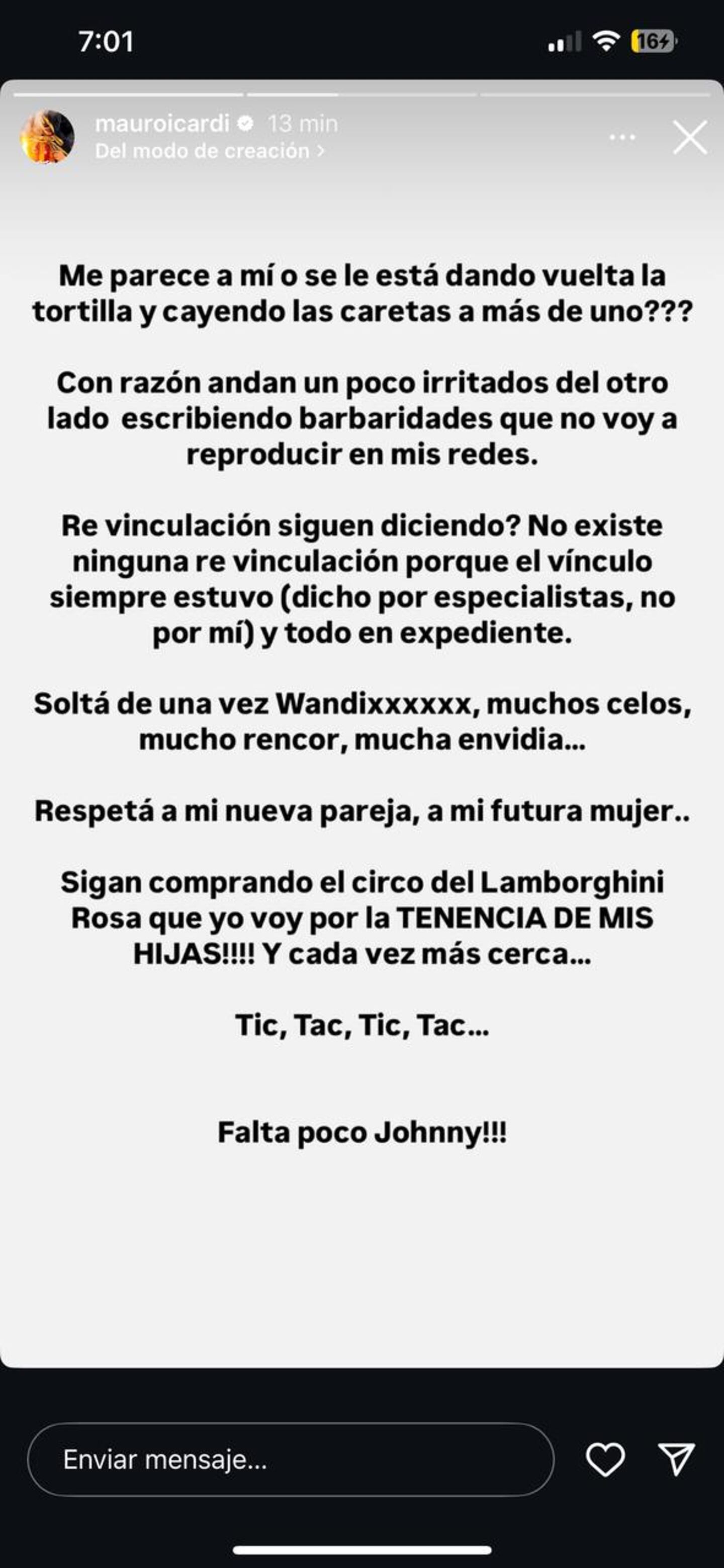 El término 'revinculación' comenzó a circular desde que Wanda Nara instaló el concepto mediante comentarios en redes sociales. Esto sucede en el contexto de falsas interpretaciones sobre el tiempo que Mauro pasó sin contacto físico con sus hijas. Sin embargo, el deportista contraatacó estas versiones aclarando que no hay tal cosa como una "revinculación", porque su relación con sus hijas nunca se quebró verdaderamente, siendo estos rumores una estrategia para manifestar un control absoluto de la situación por parte de Wanda.