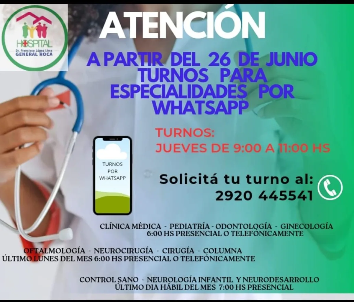 Desde este jueves 26 de junio, el hospital Francisco López Lima de General Roca implementará un nuevo sistema para solicitar turnos médicos, que funcionará exclusivamente los días jueves, de 9 a 11, a través de un número de WhatsApp. Se trata de una herramienta digital proporcionada por el Ministerio de Salud, que permitirá gestionar turnos desde el celular.