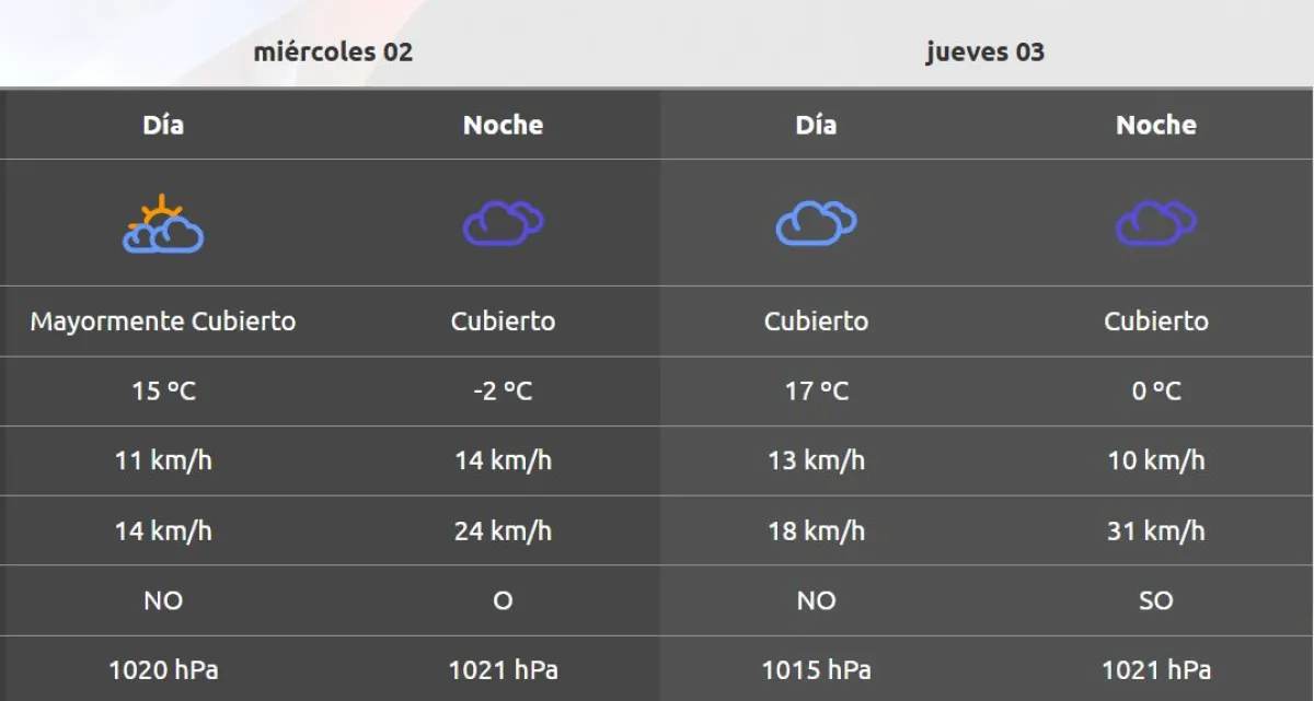 Para hoy se espera una mínima de -2° C y la máxima asciende hasta alcanzar los 15°, con el cielo parcialmente despejado y viento del noroeste de 24 km/h.