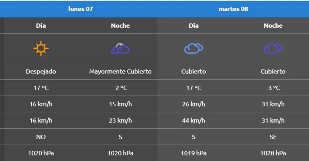 En esta oportunidad, las fuertes heladas darán descanso y la máxima estipulada será de 17 grados en horas de la tarde. Al finalizar el día, volverá a descender y en plena madrugada del martes, se ubicará en los dos grados bajo cero.