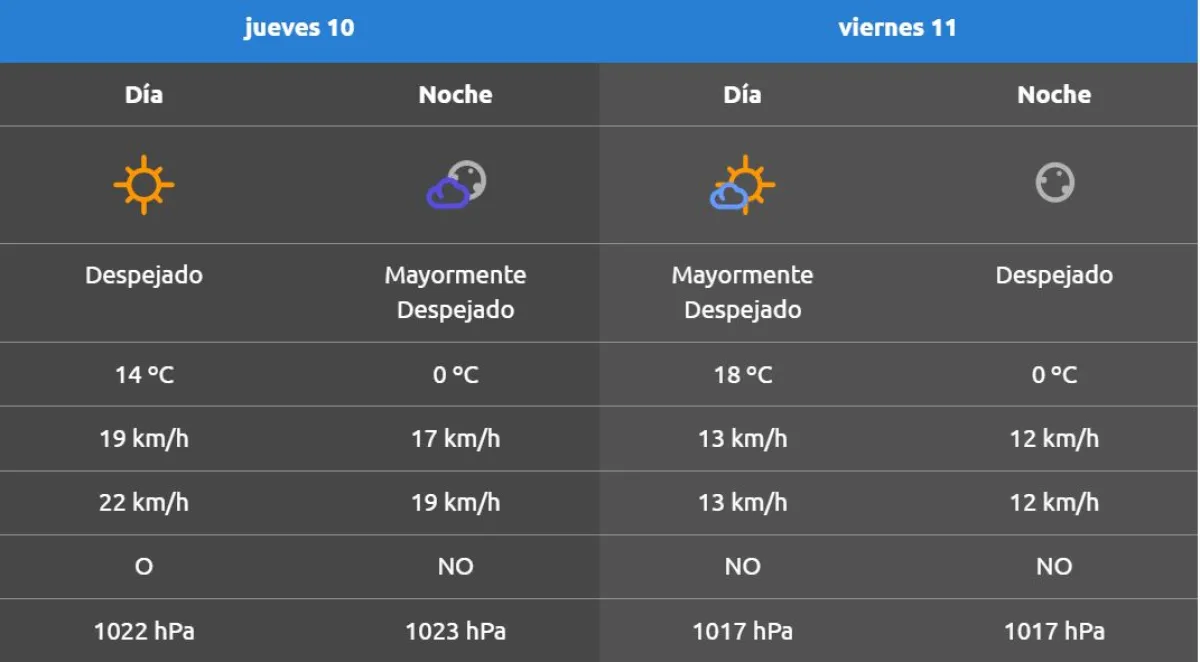 Para hoy se espera una mínima de 0° C y una máxima de 14° C. Posteriormente se viene un alivio para la región, donde predominaron las temperaturas bajo cero en las últimas dos semanas.