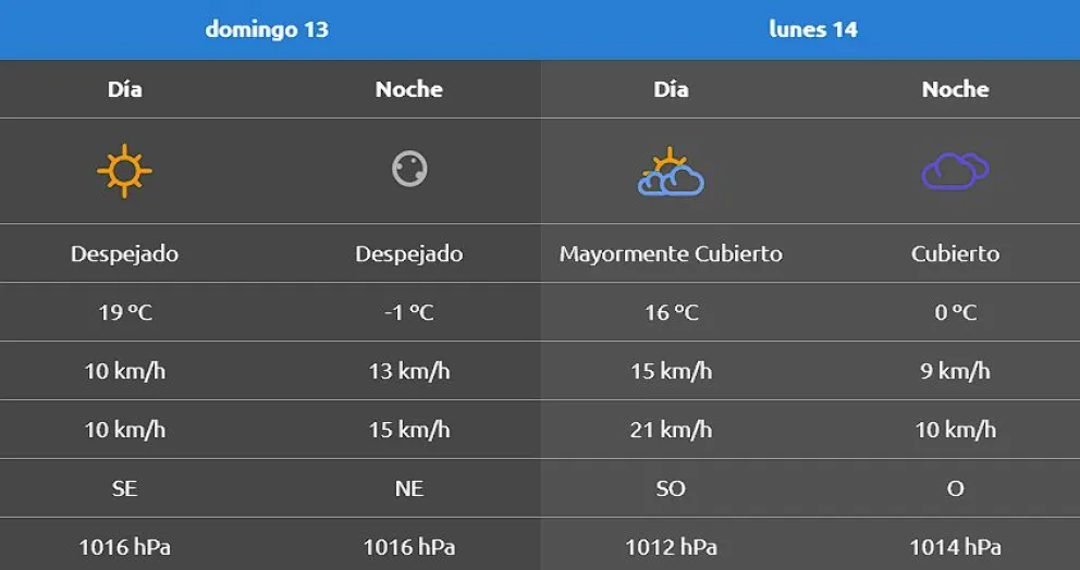 Para hoy se espera una mínima de -1° C y una máxima de 19° C.