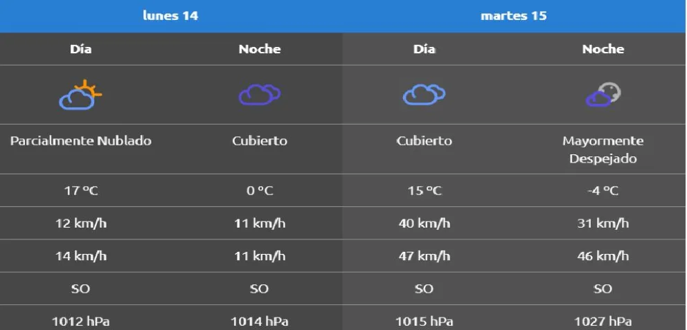 Según el ente, la máxima llegará a los 17°C mientras que la minima quedará en 0°C. En el día el cielo estará parcialmente nublado y viento del sudoeste a 14 kilómetros por hora. En la noche, habrá cielo cubierto y una temperatura que quedará por encima de los 0 grados