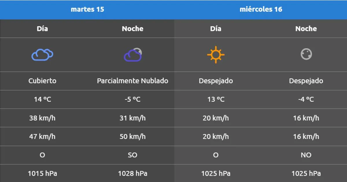 Desde la madrugada del martes, comenzará a intensificarse el viento con ráfagas que irán en aumento hasta llegar a los 47 kilómetros por hora. El miércoles será el día más frío de la semana, pero de ahí en más irá en ascenso, quizá alcance nuevamente los 20° el viernes.