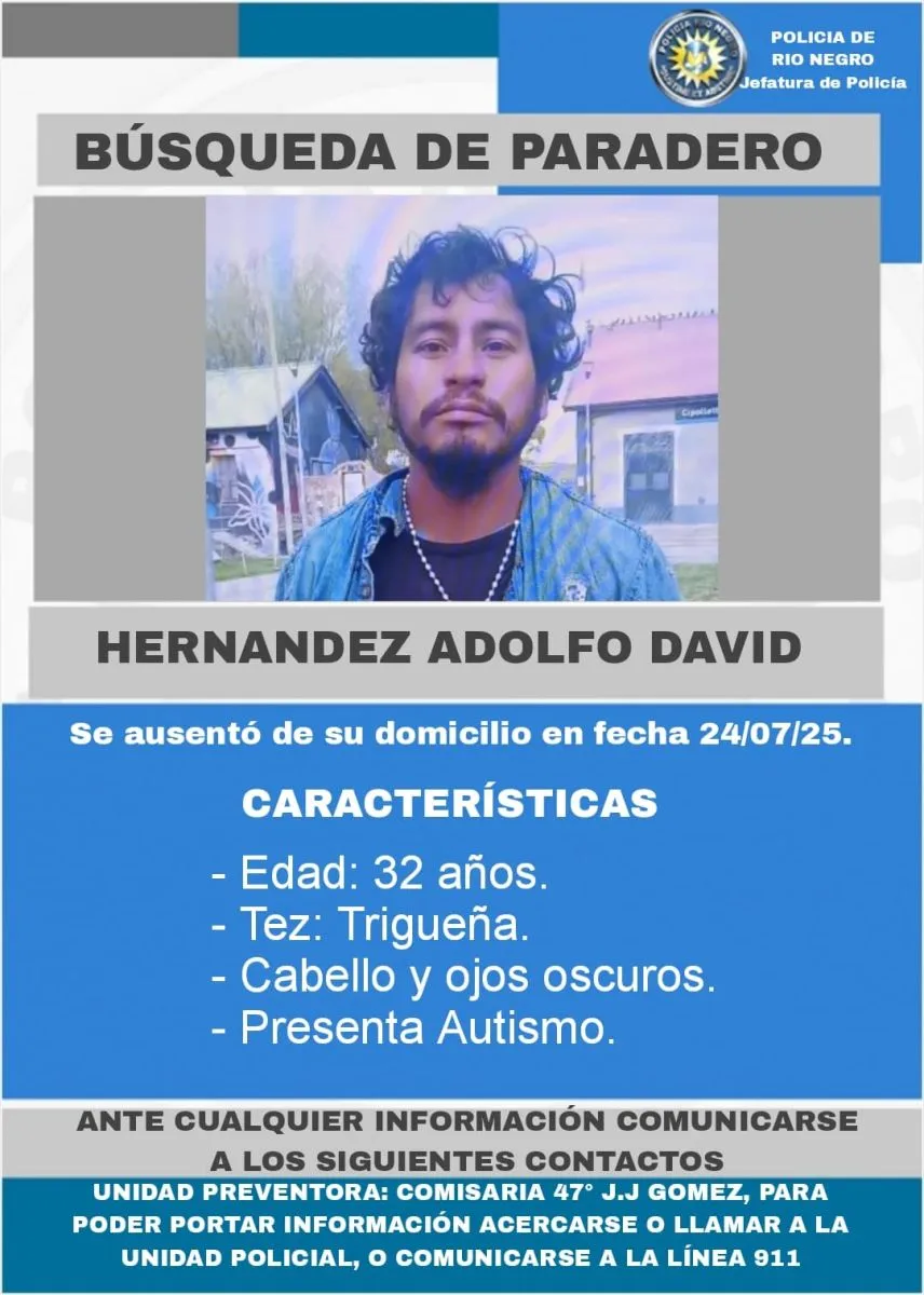 Buscan a un hombre con autismo en la ciudad de General Roca. Se trata de Adolfo David Hernández, una persona de 32 años. Sus familiares, al no tener información de él, tomaron la decisión de hacer la denuncia este jueves y desde entonces comenzó la búsqueda.