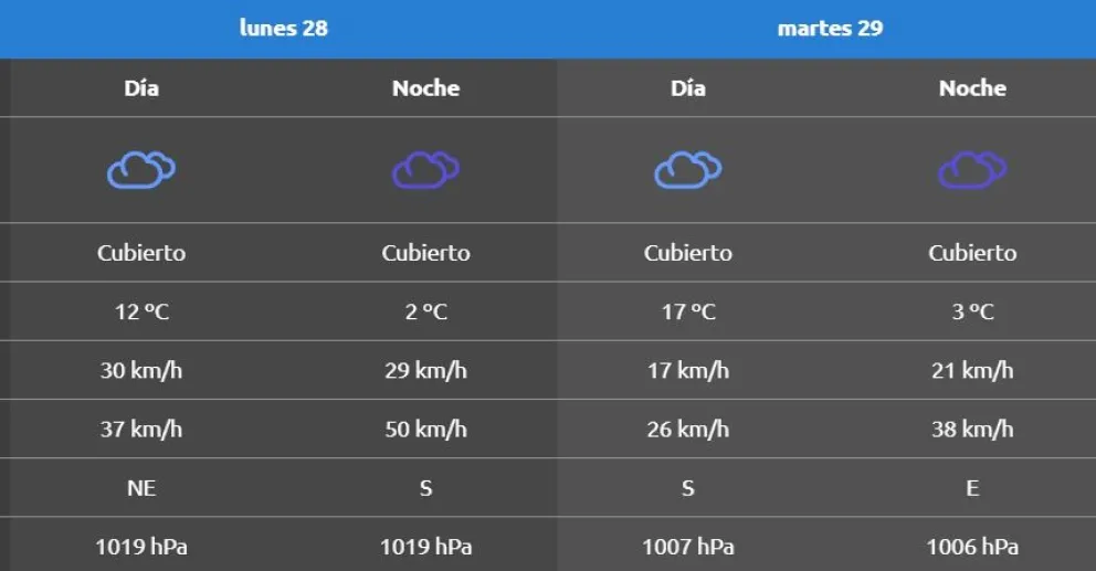 El lunes, será una jornada con cielo cubierto y una máxima que llegará a los 12°C mientras que en la noche, descenderá a 2°C. La nieve, le dará lugar al viento que circulará a 30 kilómetros por hora durante el día y en la noche, presentará ráfagas de hasta 50 kilómetros por hora