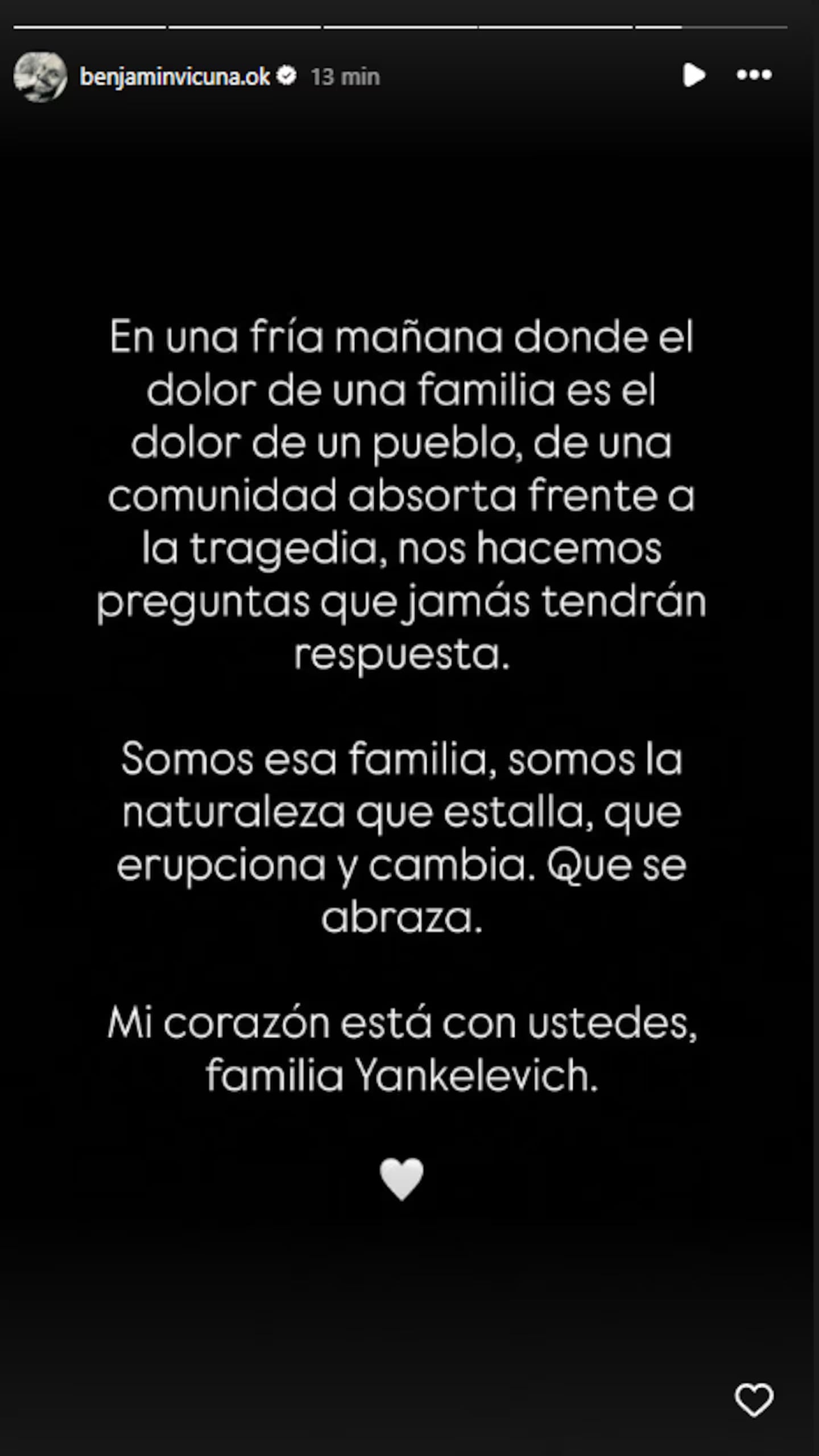 Quien también se sumó a este abrazo colectivo fue Benjamín Vicuña. Minutos después de que se conociera la triste noticia, el actor compartió un mensaje muy sentido en sus historias de Instagram. “En una fría mañana donde el dolor de una familia es el dolor de un pueblo, de una comunidad absorta frente a la tragedia, nos hacemos preguntas que jamás tendrán respuesta”, escribió.