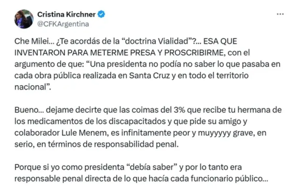 Cristina Kirchner, con su característico estilo directo y contundente, usó el "Che Milei..." para rememorar la "doctrina Vialidad" de la que ella misma fue objeto de acusaciones. Kirchner compara su caso con la situación actual, subrayando que en su tiempo se argumentó que una presidenta debía tener conocimiento detallado de cada contratación estatal. "¿Qué vas a decir ahora?", desafió la exmandataria, poniendo en relieve la responsabilidad de Milei en este caso.