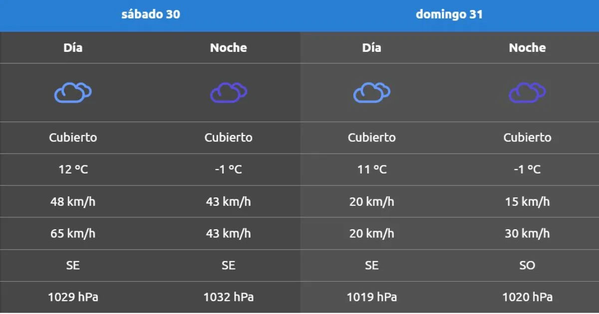Se estiman valores de precipitación acumulada entre 20 y 40 mm, pudiendo ser superados de manera puntual. Para este sábado se espera una mínima de -1° C y una máxima de 12° C.