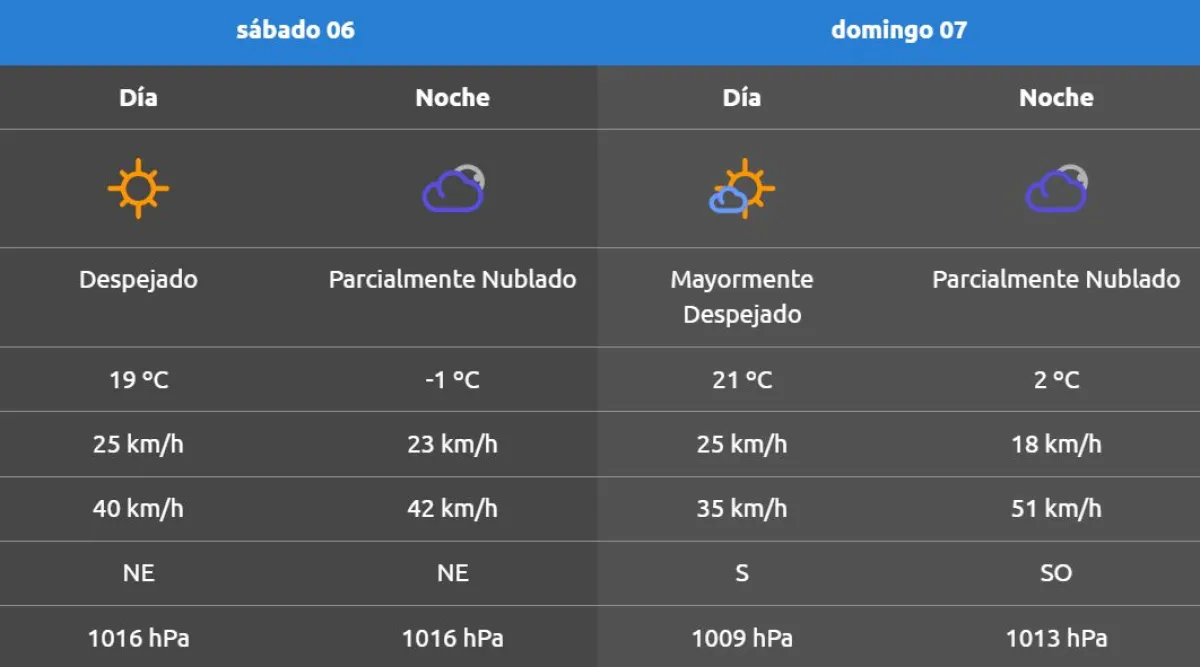 Durante el fin de semana se espera el ingreso de aire más cálido y húmedo del noreste con paulatino descenso de la presión atmosférica y ascenso de la temperatura. Continúa la probabilidad de heladas débiles las próximas dos noches, con cielo mayormente despejado.