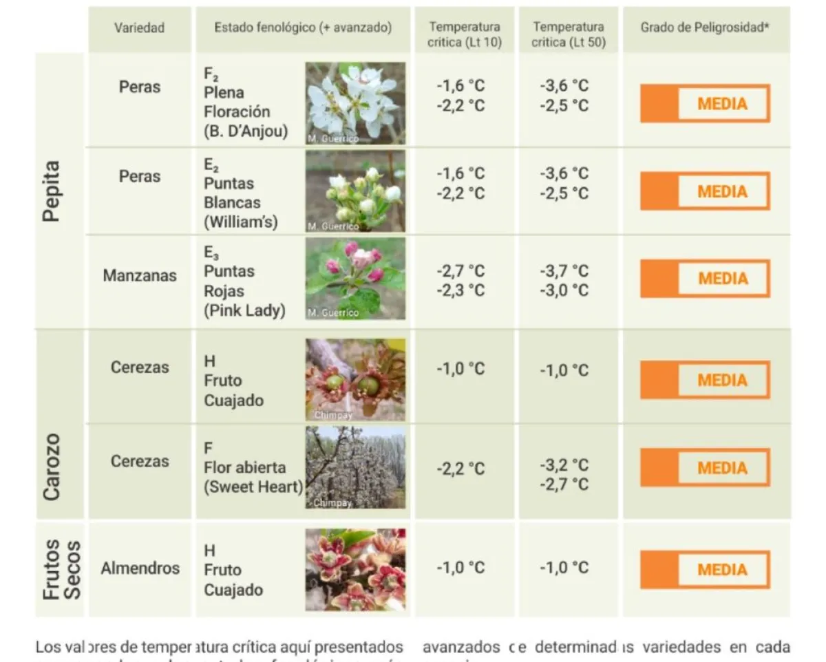 La fruta de pepita es la más vulnerable en esta etapa, en particular la manzana Pink Lady aparece en el informe con un grado de peligrosidad media, ya que podría sufrir daños alcanzando temperaturas de hasta –3,7 °C.