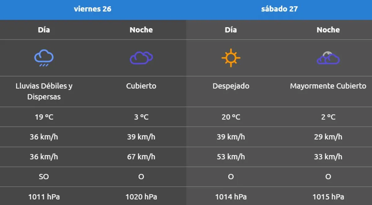 Tras dos jornadas ventosas en la región, se espera que este viernes el viento se mantenga entre los 36 y 39 km/h, con ráfagas que quizá alcancen los 67 km/h. El descenso de temperatura traerá consigo posibilidad de lluvia.
