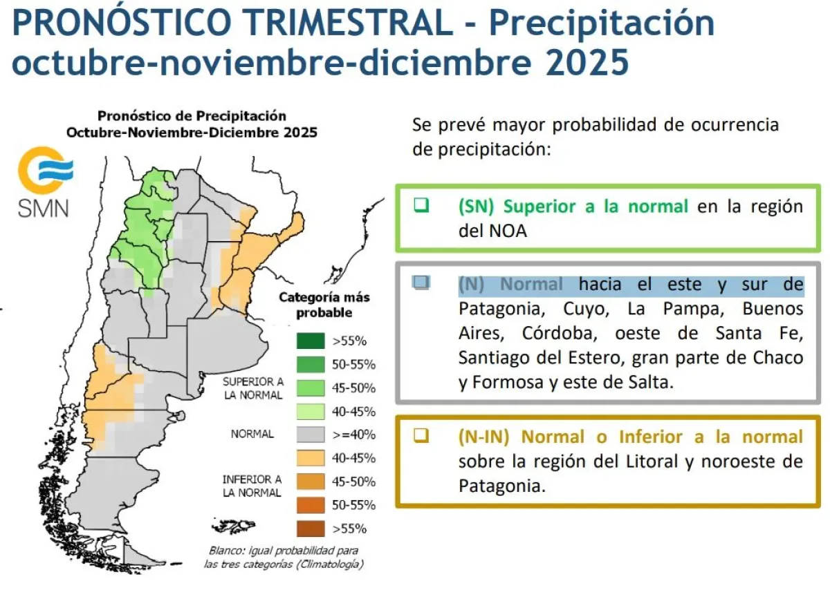 En cuanto a las temperaturas, se prevé que estarán entre lo normal y lo superior a lo normal, lo que sugiere que el trimestre podría registrar días más cálidos de lo habitual para la época. Desde el SMN aclararon que estas previsiones se basan en valores medios del trimestre y que las oscilaciones de menor escala podrían generar variaciones locales en días o semanas específicas.