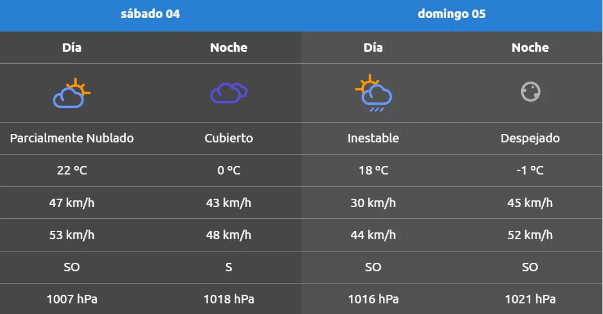 La Autoridad Interjurisdiccional de Cuencas (AIC) emitió su pronóstico para este sábado 4 de octubre. Para hoy se espera una mínima de 0° C y una máxima de 22° C.