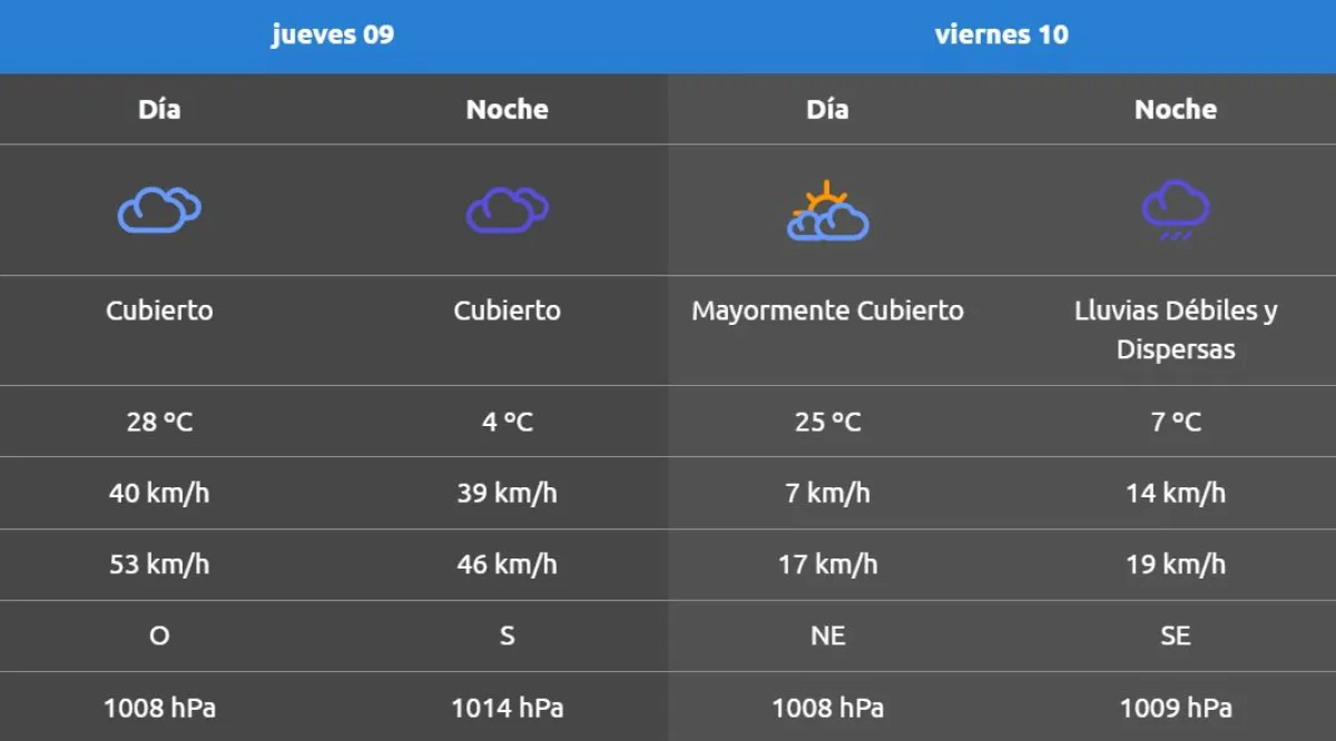 Tras un miércoles con tiempo bueno con cielo mayormente cubierto para la zona de los valles, meseta y costa, se espera un jueves con temperaturas similares, aunque con una presencia más marcada de viento de 40 km/h y con ráfagas de hasta 53 km/h.