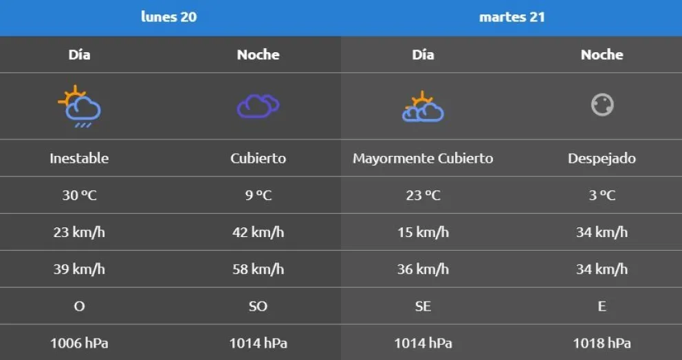 El lunes comenará la jornada algo soleado con periodos inestables y hacia la noche el cielo estará cubierto. La máxima llegará a los 30°C y descenderá a 9°C después del atardecer. El viento, se presentará con ráfagas de entre  39 y 58 kilómetros por hora, proveniente del oeste girando hacia el sudoeste.