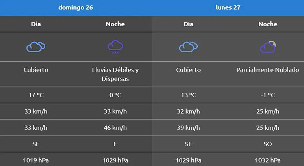 La Autoridad Interjurisdiccional de Cuencas (AIC) emitió su pronóstico para el domingo 26 de octubre, anticipando un fin de semana electoral marcado por bajas temperaturas y precipitaciones. A partir de la noche del domingo se prevé rotación de los vientos al sudeste, con ingreso de aire frío antártico que provocará precipitaciones generalizadas y un importante descenso de la temperatura.
