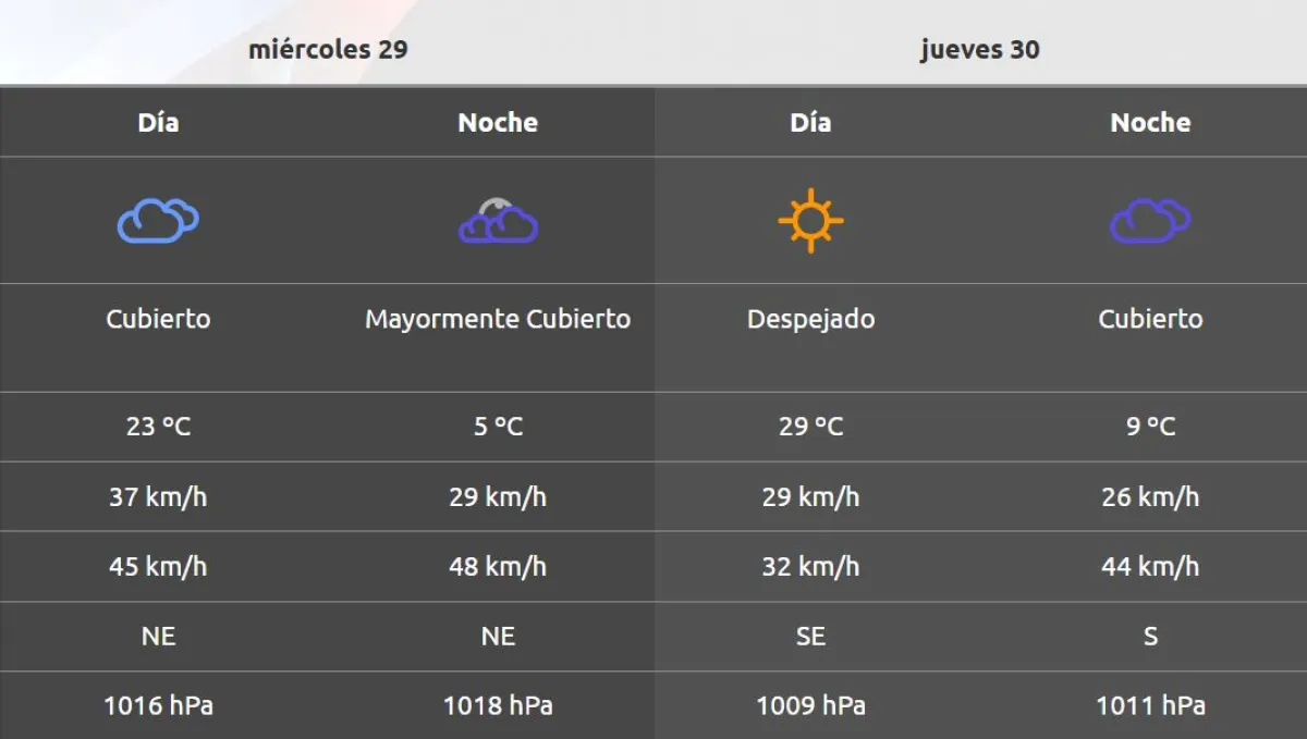 Recién el jueves aumentan las temperaturas hasta alcanzar casi los 30 grados, con el cielo totalmente despejado y un poco de viento del suroeste.