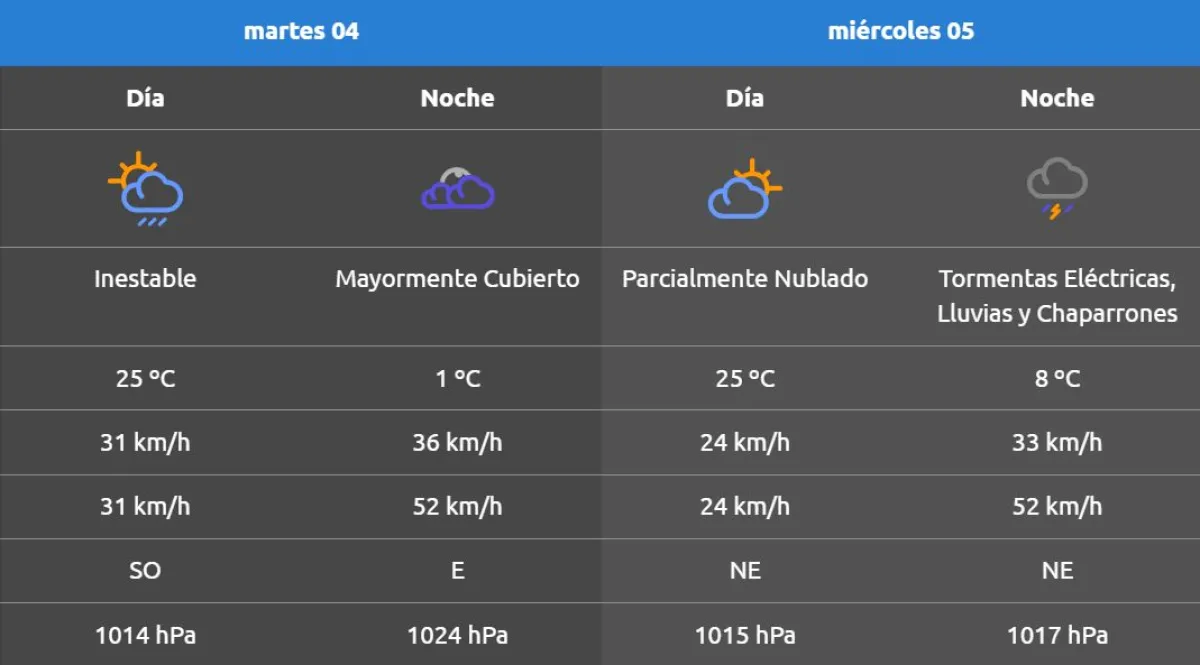 Aunque el comienzo de semana se presentó cálido, se espera que a partir de este martes aumente la inestabilidad con precipitaciones de entre el 10 y el 40 %. Para el miércoles a la noche está pronosticado tormentas eléctricas, acompañadas de viento que alcanzará los 52 km/h.