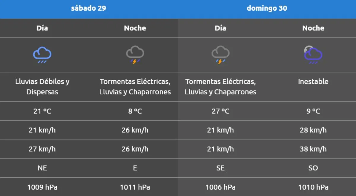 El Servicio Meteorológico Nacional (SMN) emitió su pronóstico para este sábado 29 de noviembre. Para hoy se espera una mínima de 14° C y una máxima de 25° C. Se prevén lluvias intensas, tormentas eléctricas, ráfagas de viento de hasta 90 km/h y caída de granizo.
