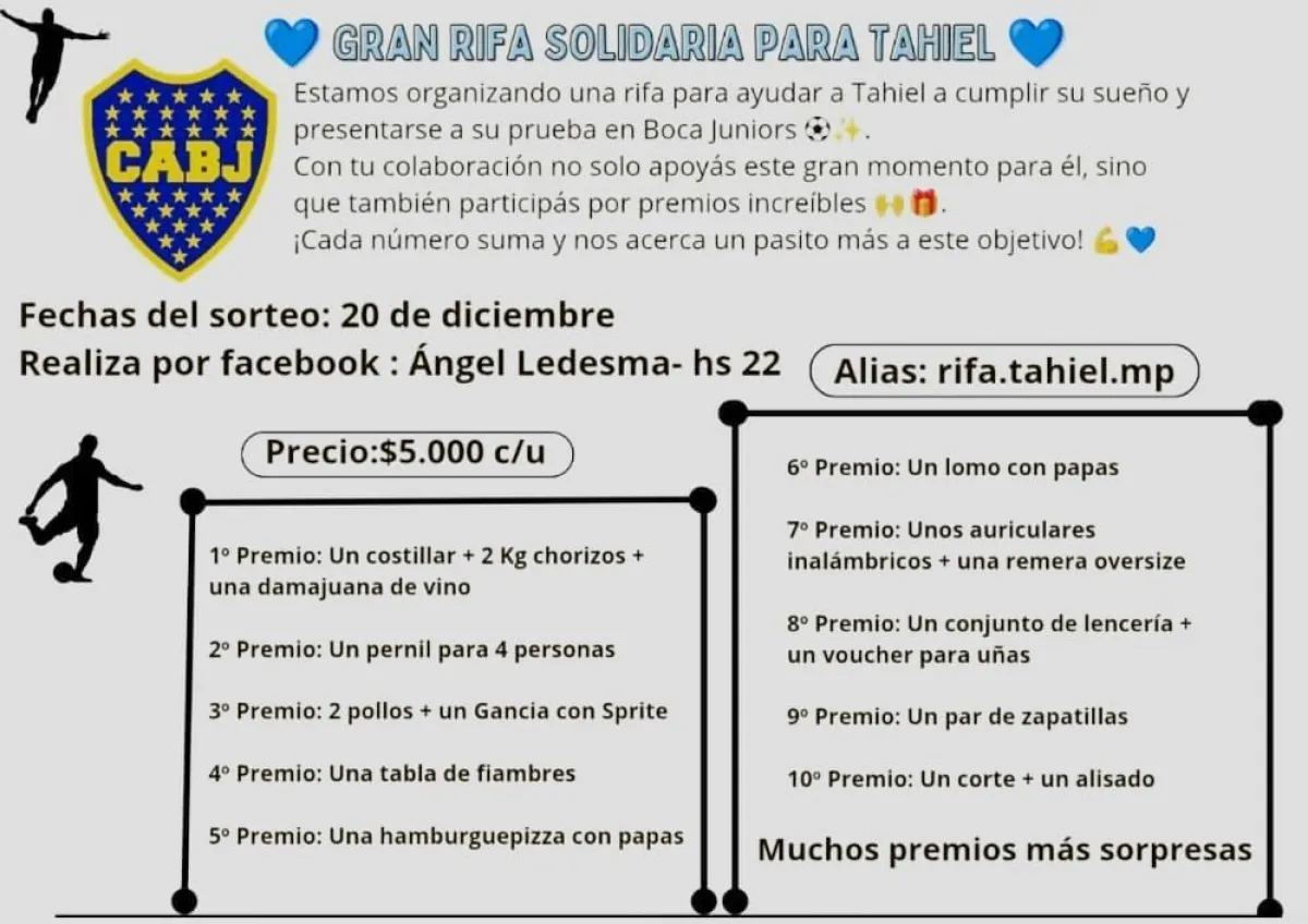 Para poder afrontar el viaje a Buenos Aires, su familia organiza una colecta solidaria. “Estamos organizando una rifa para solventar los pasajes, gastos de estadía y traslado en Buenos Aires. Y también se puede colaborar económicamente con transferencias, todo lo que envían por poquito que sea suma”, dijo Ángel, quien compartió el alias para colaborar: rifa.tahiel.mp.