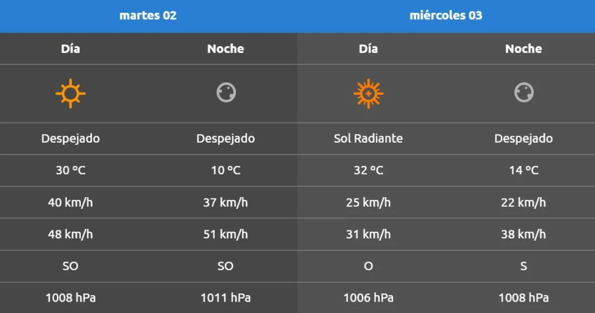 Durante la jornada del martes el cielo se mantendrá totalmente despejado y llegarán periodos de viento moderado a Alto Valle, oscilando entre los 37 y 41 km/h, alcanzando puntualmente ráfagas de 51 km/h.