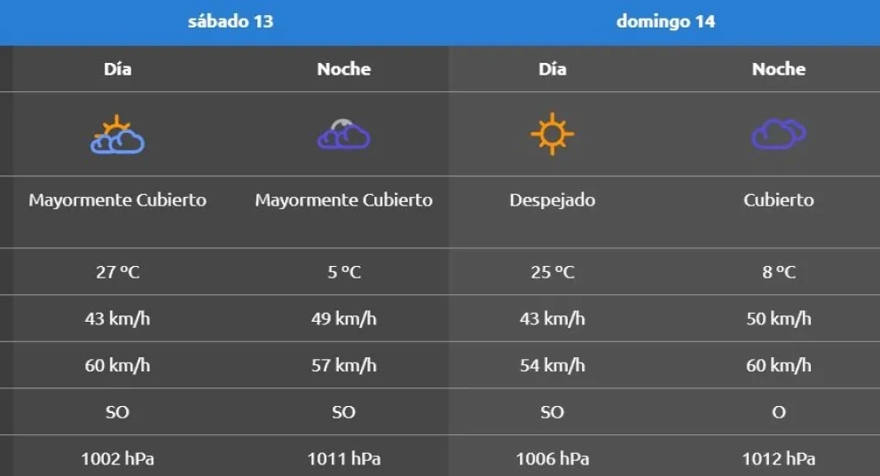 Según la AIC, el cielo se mantendrá parcialmente nublado con una máxima de 27 grados y una mínima de 5°C. Las condiciones mejorarían durante la noche y madrugada del domingo.