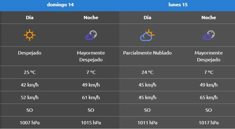 La máxima para la tarde será de 25 grados y en la noche, caerá a 7 grados. Algunas nubes se harán presentes y el viento, como en toda la jornada, será moderado con ráfaagas de 60 kilómetros por hora.