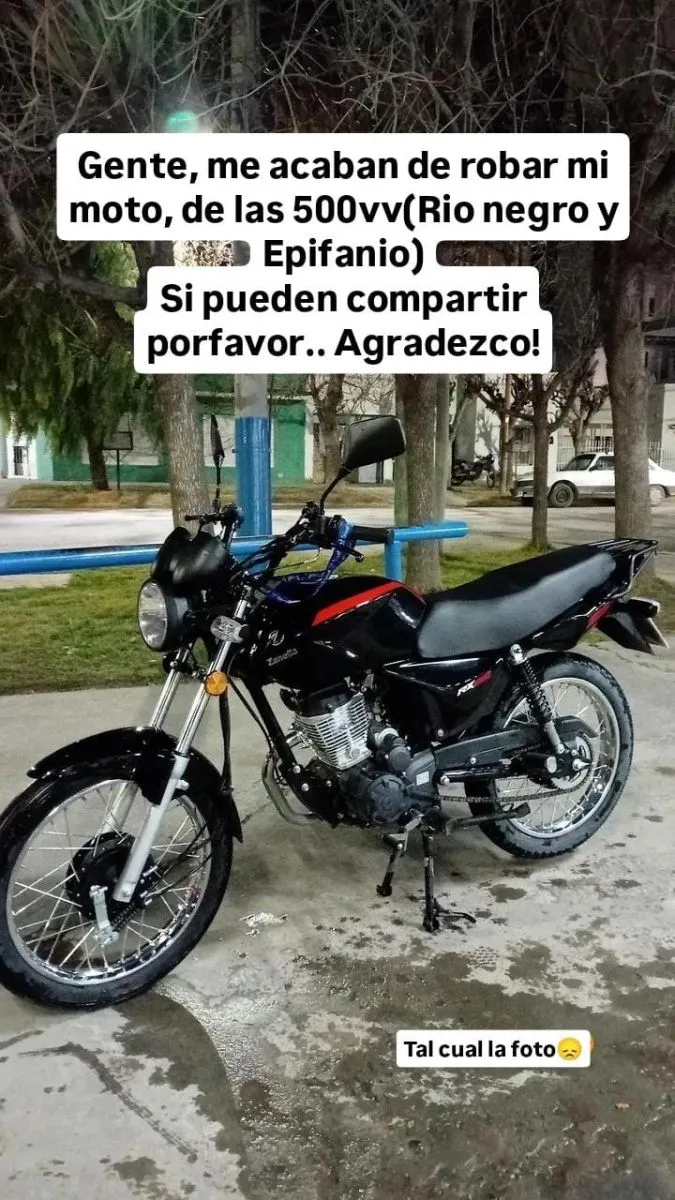 En redes sociales, la vecina lamentó el robo de su moto 0km y pide a la comunidad ayuda para recuperarla. Foto cortesía