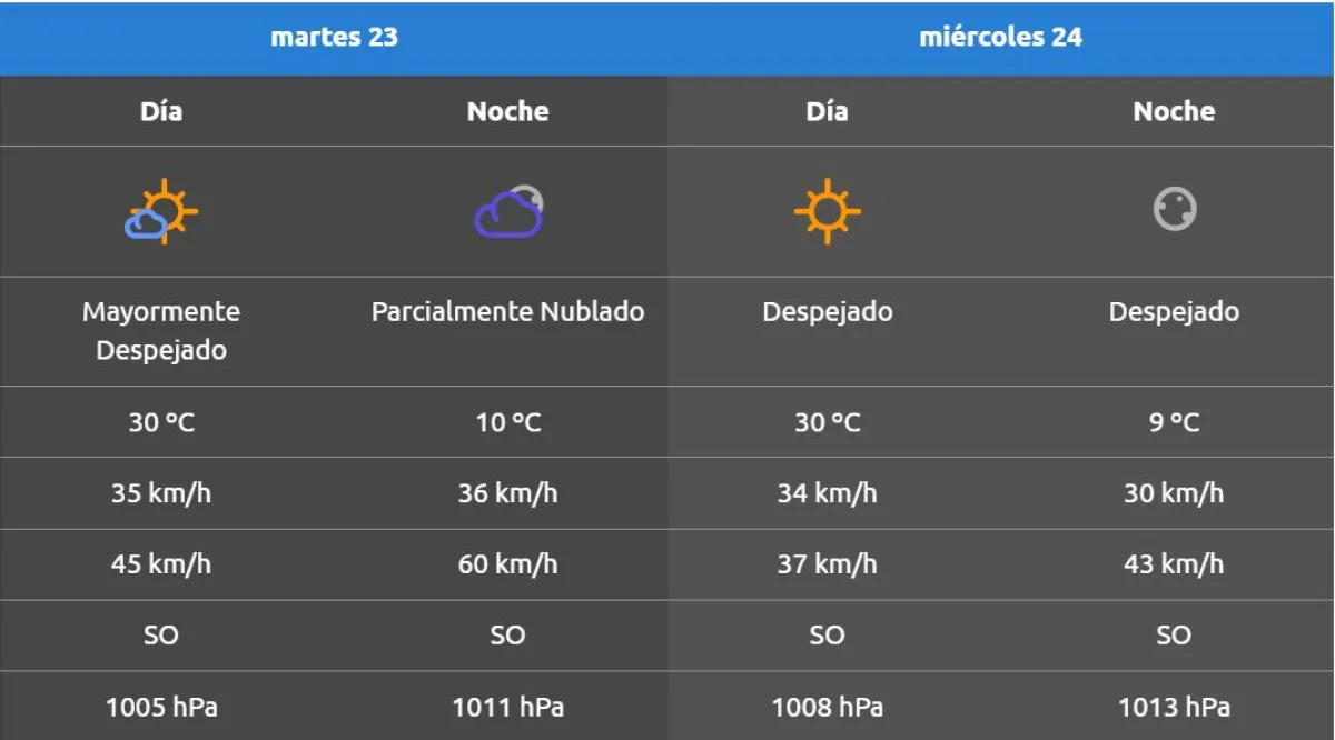 Para el 24 se espera que el cielo esté totalmente despejado, con una máxima de 30 °C, y una mínima que alcanzará los 10 °C. El jueves 25 tendrá una máxima de 30 °C, sin viento y con una caída a 9 °C en la noche.